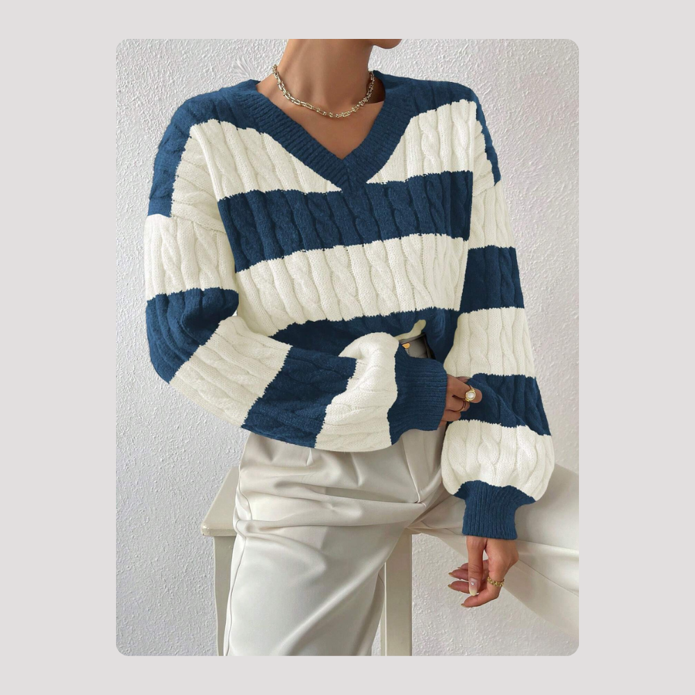 Ein moderner Klassiker für kühle Tage: Diesergestreifte Strickpulloverüberzeugt mit seinem weichen, strukturierten Maschenmuster und einem schmeichelndenV-Ausschnitt. Dieweiten Ärmelund daslässige Oversized-Designsorgen für einen entspannten, dennoch eleganten Look. Perfekt kombinierbar mit Jeans, Stoffhosen oder Röcken – für einen mühelos stylischen Auftritt im Alltag.